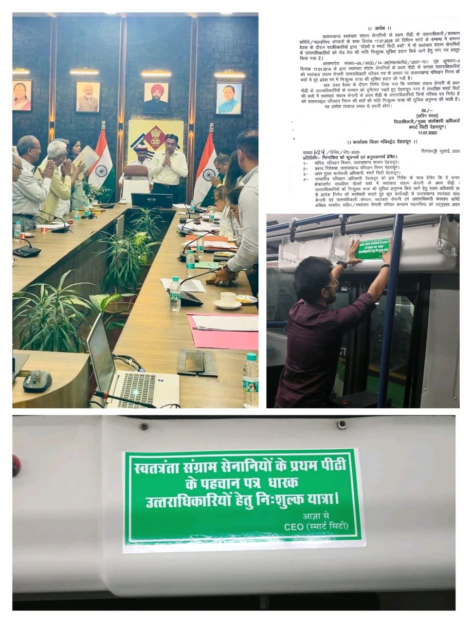 देहरादून दिनांक 25 जुलाई 2025, (सू.वि) जनमानस से जुड़े मामलों में जिला प्रशासन की संवदेनशीलता बढ गई है। जिलाधिकारी सविन बंसल के निर्देशन में जिला प्रशासन सक्रिय रूप से जनमानस के प्रति अपने दायित्वों का निर्वहन पूर्ण जिम्मेदारी एवं कुशलतापूर्वक कर रहा है। जिलाधिकारी की अध्यक्षता में आयोजित बैठक में स्वतंत्रता संग्राम सेनानियों के उतराधिकारियों ने जिलाधिकारी से रोडवेज व स्मार्ट सिटी की बसों में निःशुल्क यात्रा का अनुरोध किया गया था, जिस पर डीएम ने बैठक के बीच में ही आदेश जारी करते हुए स्वतंत्रता संग्राम सेनानियों के उत्तराधिकारियों को तोहफा दिया। तथा रोडवेज पर फ्री यात्रा के लिए जीएम से पत्राचार करने का आश्वासन दिया है। अब स्वतंत्रता संग्राम सेनानियों के उत्तराधिकारियों के लिए फी यात्रा की सुविधा रहेगी जिससे डीएम के आन द स्पॉट निर्णय पर खुशी जाहिर करते स्वतंत्रता संग्राम सेनानियों के उत्तराधिकारियों ने हुए डीएम का धन्यवाद दिया। अब स्मार्ट सिटी की बसों में स्वतंत्रता संग्राम सेनानियों के उत्तराधिकारियों हेतु फ्री यात्रा का फ्लेक्स भी चस्पा कर दिया गया है।